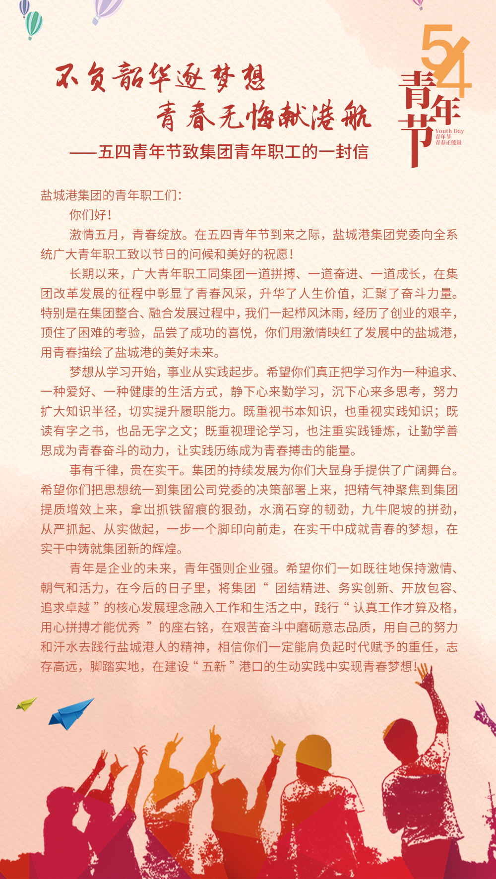 激情五月,青春綻放。在五四青年節(jié)到來(lái)之際,鹽城港集團(tuán)黨委向全系統(tǒng)廣大青年職工致以節(jié)日的問(wèn)候和美好的祝愿!
