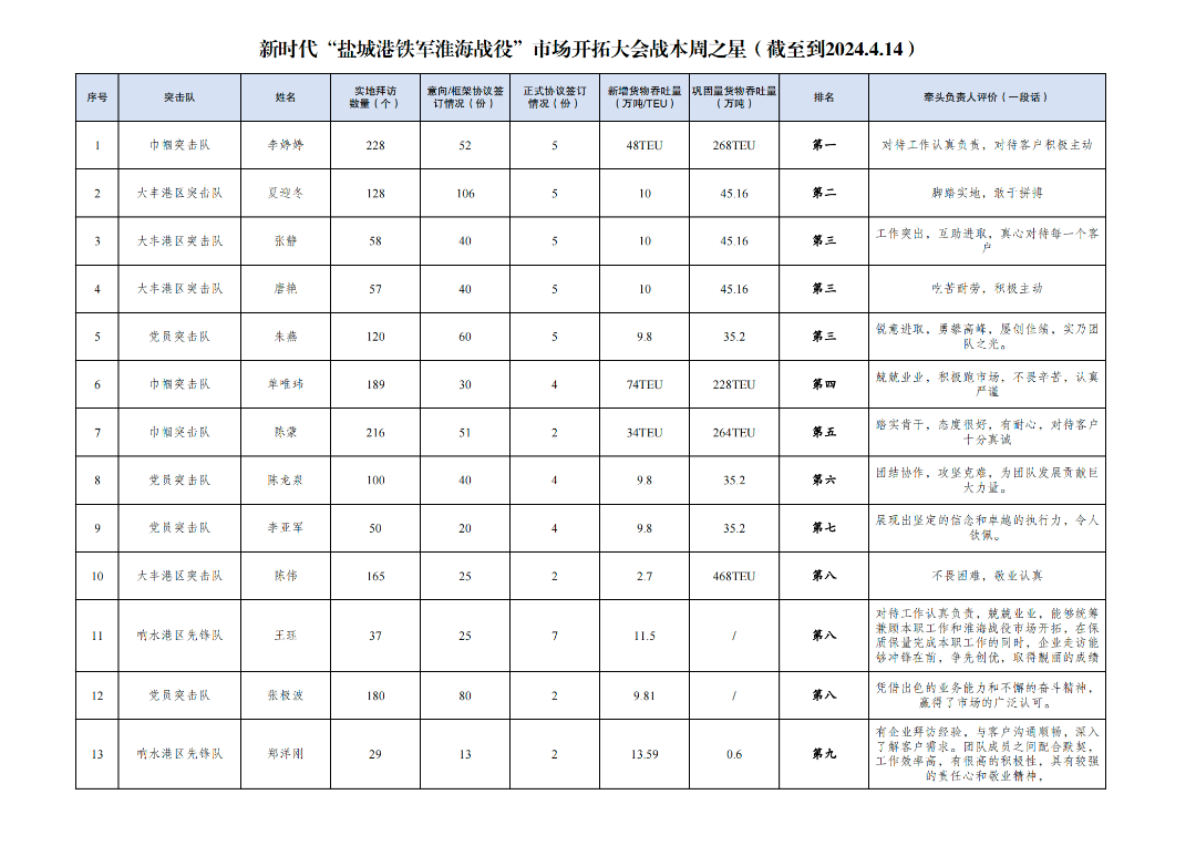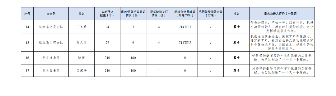 第三名:大豐港區突擊隊 張靜(拜訪客戶58家,簽訂意向協議40份,簽訂正式協議5份,新增貨物吞吐量10萬噸,鞏固量貨物吞吐量45.16萬噸);大豐港區突擊隊 唐艷(拜訪客戶57家,簽訂意向協議40份,簽訂正式協議5份,新增貨物吞吐量10萬噸,鞏固量貨物吞吐量45.16萬噸);黨員突擊隊 朱燕(拜訪客戶120家,簽訂意向協議60份,簽訂正式協議5份,新增貨物吞吐量9.8萬噸,鞏固量貨物吞吐量35.2萬噸)。