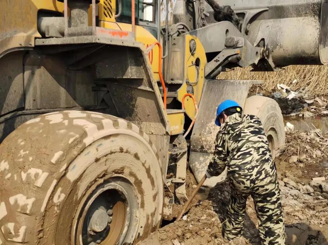 面對連續的失敗,響水港區團隊再次展現出了百折不撓,迎難而上的港口工匠精神,深刻剖析前兩次失敗原因,再次調集一臺小型挖機對事件車輛輪子周邊淤泥進行清理,回填石子提升其自身摩擦力,同時針對涉險裝載機陷入太深可能造成底盤擱置等情況,調配一輛裝載機協助抬升予以解決,并再次調集一輛裝載機采用接力模式增加牽引力。經過多臺機械的通力配合,受困裝載機終于在拖拽中緩緩駛出泥潭,圓滿完成救援工作。