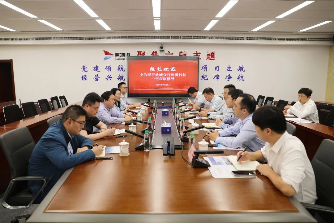 周正雄對韓勇一行的到來表示歡迎,對中信銀行鹽城分行在鹽城港發展過程中給予的關心和支持表示感謝,并介紹了鹽城港相關情況。他說,沿海發展是鹽城發展的重要增長極,港口發展是海洋經濟發展的重要組成部分。集團自成立以來,統籌抓好基礎設施建設、資產資源調優、生產經營各項工作,多項經營指標取得突破,在全國沿海港口中保持爭先進位。當前,集團積極策應“水運江蘇”建設,緊抓淮河入海水道改航道及鐵路支線開通等重大機遇,聚焦服務產業功能配套,加快航道、碼頭等10類能級提升項目建設,全力打造“公鐵河海”多式聯運體系。同時,加快推進淮河流域布點,積極構建淮河沿線和黃河故道沿線港口“朋友圈”,形成“港口聯盟”,全力培育鹽城港未來的喂給港,為鹽城港邁入高質量發展“黃金期”奠定堅實基礎。希望中信銀行鹽城分行一如既往地關心支持鹽城港發展,在“港口+”業務、資本運營等方面為鹽城港提供更多支持,進一步找準合作的切入點,開發更多適合港口的金融產品,為鹽城港的發展提供強有力的金融支撐。