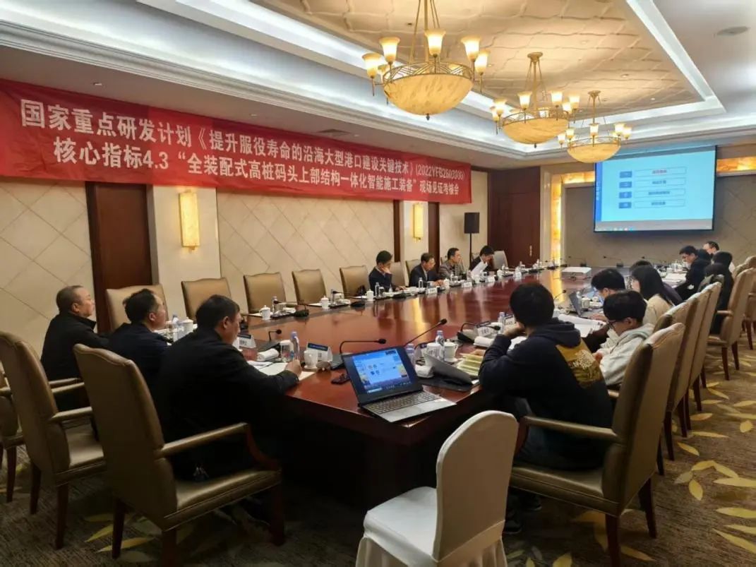 本工程位處大豐港區(qū)開敞海域,常年風(fēng)浪大,最大潮差達(dá)到6米,漲落潮流急,傳統(tǒng)浮式起重船無法完成上部結(jié)構(gòu)施工。為解決惡劣海況下碼頭上部結(jié)構(gòu)快速安裝問題,為項(xiàng)目量身打造的智能筑港機(jī),該設(shè)備配備了數(shù)字監(jiān)控平臺(tái),在安裝下放過程中,系統(tǒng)自動(dòng)識(shí)別梁板安裝目標(biāo)位置圖像后,將構(gòu)件快速、平穩(wěn)、精準(zhǔn)落入,實(shí)現(xiàn)全過程智能安裝。全裝配式高樁碼頭上部結(jié)構(gòu)一體化智能施工裝備是國家重點(diǎn)研發(fā)計(jì)劃項(xiàng)目的核心指標(biāo),趁此階段項(xiàng)目組組織召開了現(xiàn)場見證考核會(huì),邀請(qǐng)來自鹽城市交通運(yùn)輸局、鹽城市港航事業(yè)發(fā)展中心、鹽城市交通規(guī)劃設(shè)計(jì)院等單位的專家到現(xiàn)場進(jìn)行見證考核,經(jīng)過現(xiàn)場考察、會(huì)議審查及資料查閱,一致認(rèn)為達(dá)到了考核指標(biāo)要求,至此該裝備研發(fā)在此項(xiàng)目上的科技創(chuàng)新示范應(yīng)用得到了有力的成功驗(yàn)證。