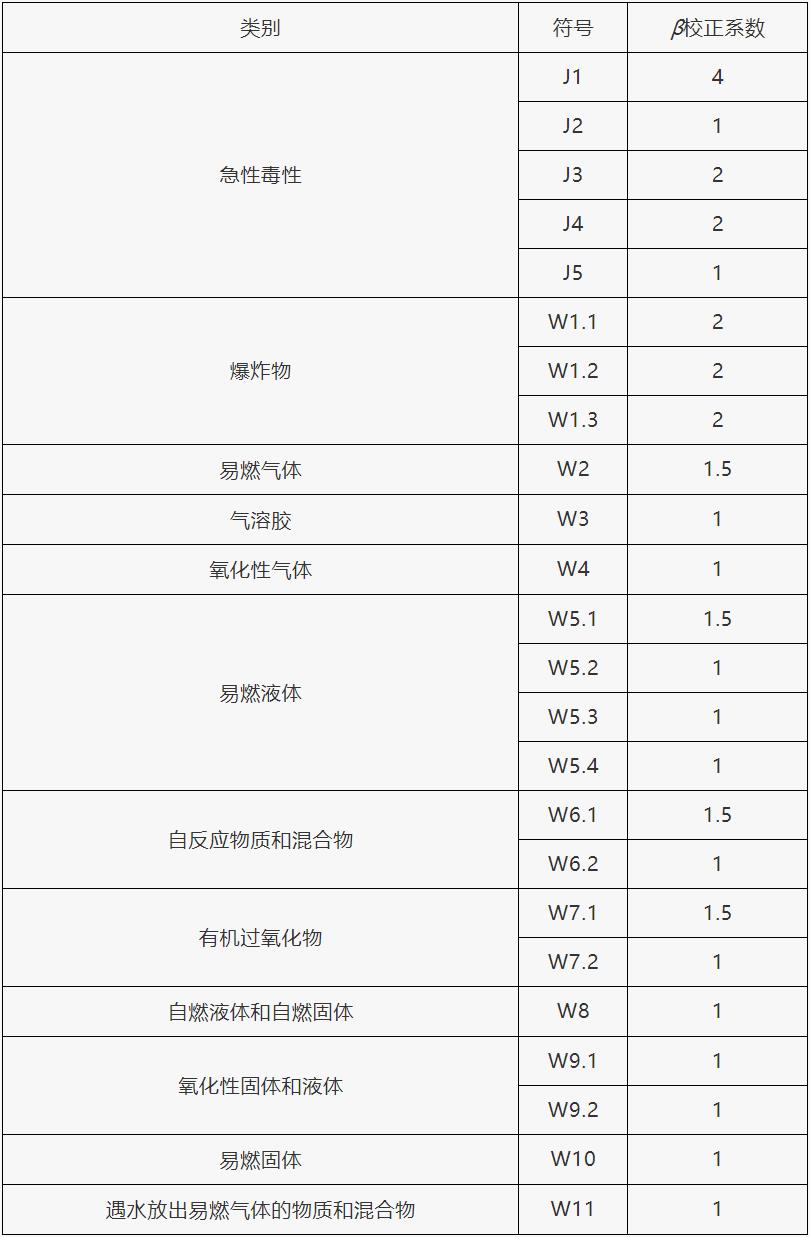根據(jù)單元內(nèi)危險貨物的類別不同,設(shè)定校正系數(shù)(β)值,在表1范圍內(nèi)的危險貨物,其β值按表1確定,未在表1范圍內(nèi)的危險貨物,其β值按表2確定。