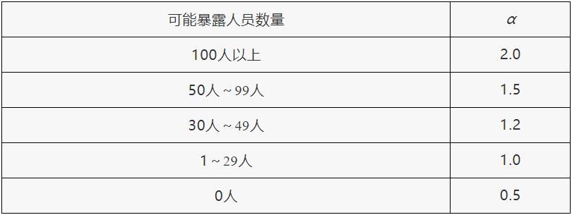 根據(jù)重大危險源所在港口企業(yè)作業(yè)區(qū)邊界向外擴展500米范圍內(nèi)常住人口數(shù)量,設(shè)定暴露人員校正系數(shù)(α)值,見表3。