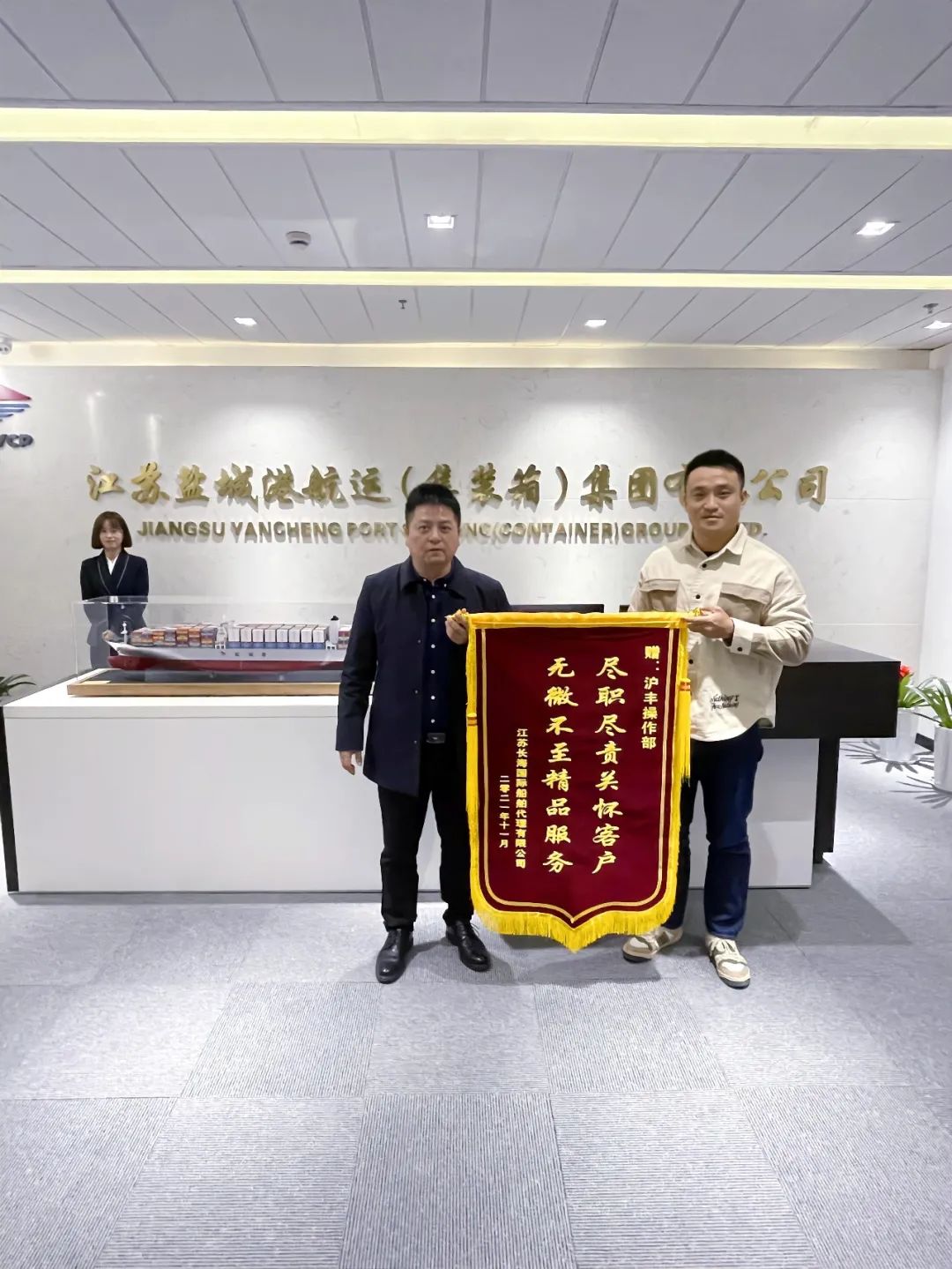 11月12日,江蘇長海國際船舶代理有限公司業(yè)務經(jīng)理吳長春一行拜訪江蘇滬豐集裝箱物流有限公司,將一面寫有“盡職盡責關(guān)懷客戶,無微不至精品服務”的錦旗送到滬豐公司,對滬豐公司操作部近年來提供的優(yōu)質(zhì)高效服務表示感謝。