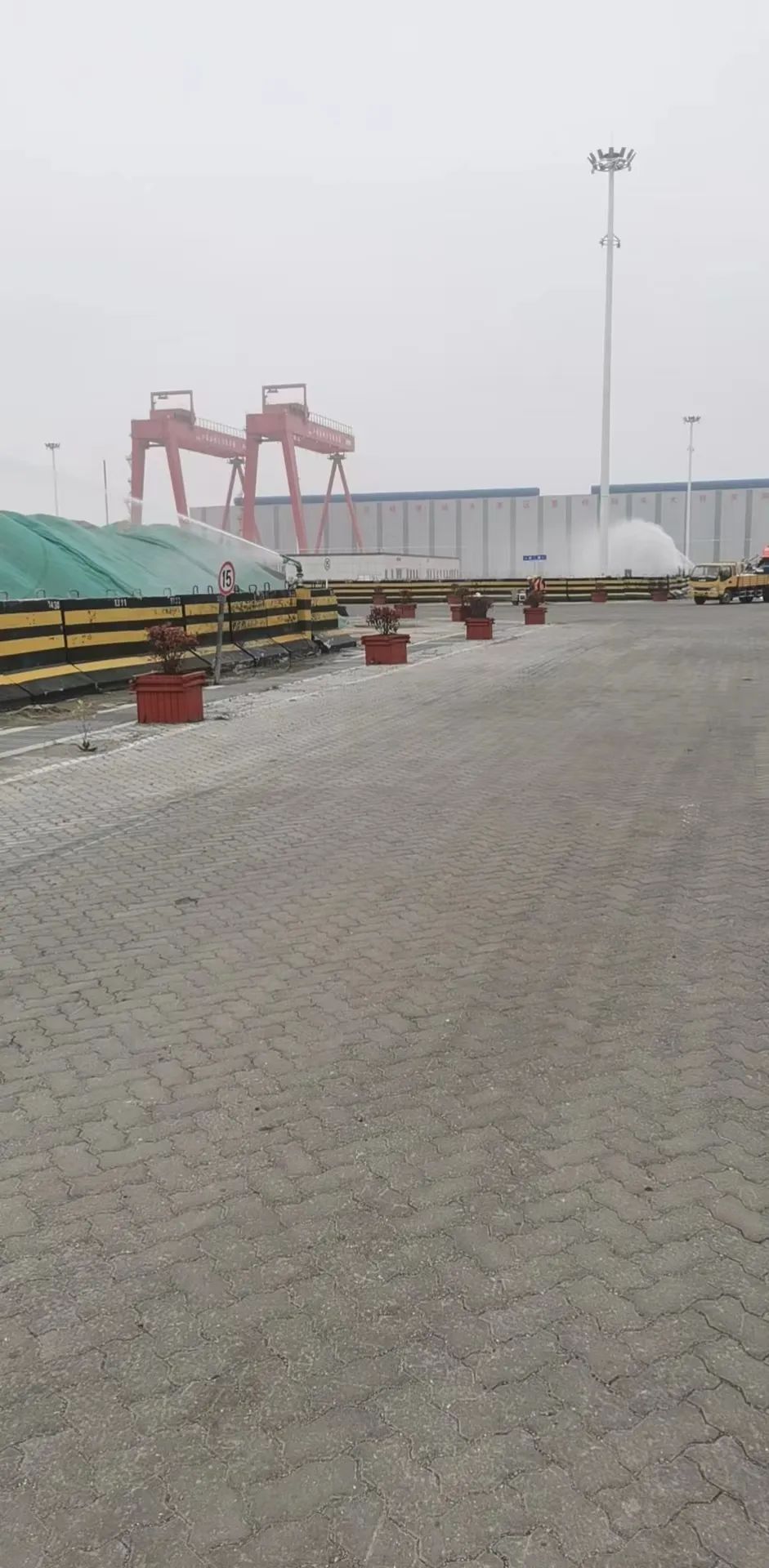 (倉(cāng)儲(chǔ)部及時(shí)開啟堆場(chǎng)噴淋設(shè)備,對(duì)苫蓋貨物進(jìn)行抑塵噴灑)