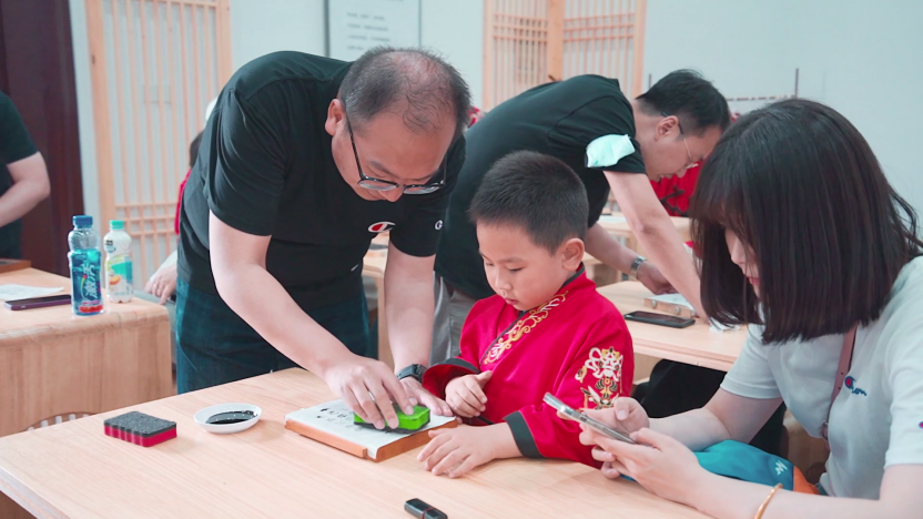 在小瀛臺國學館里,小朋友們穿著漢服走進國學課堂,悉心聆聽國學老師講解,學習活字印刷,將自己熟悉的古詩詞用一枚枚活字排列出來,在老師耐心的技術指導下,家長們也興致高漲地參與進來,從揀字到排版再到印刷,古老的印刷工藝被完美展現。