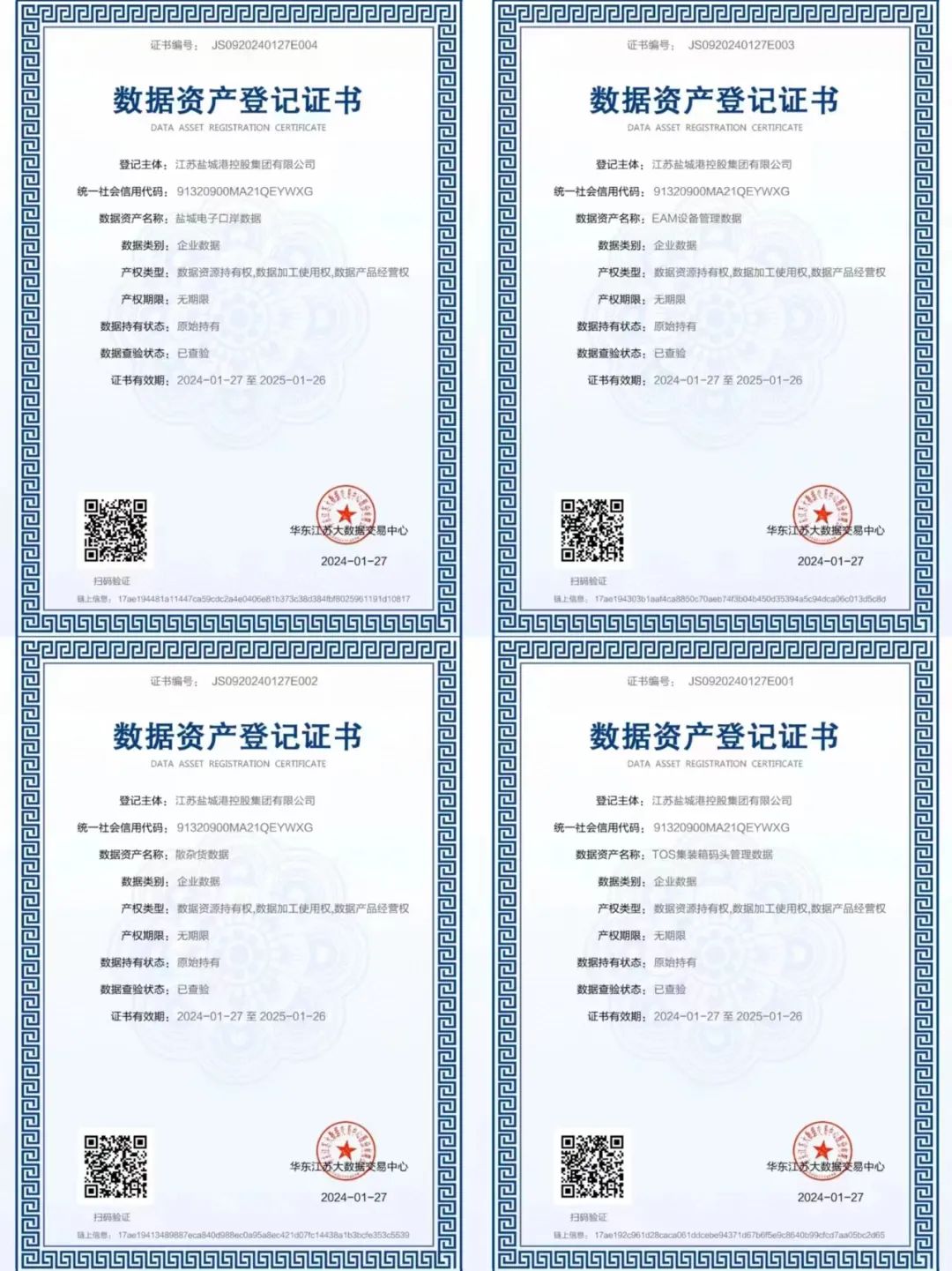 日前,鹽城港集團順利完成集裝箱碼頭生產(chǎn)操作系統(tǒng)(TOS)、電子口岸系統(tǒng)、港機設備物資管理系統(tǒng)(EAM)、散雜貨生產(chǎn)管理系統(tǒng)(MES)數(shù)據(jù)資產(chǎn)質量評價及價值評估,并獲得《數(shù)據(jù)資產(chǎn)登記證書》,成為鹽城市首批完成數(shù)據(jù)資產(chǎn)登記的企業(yè)之一,也是全國首個港口企業(yè)數(shù)據(jù)資源入表案例。