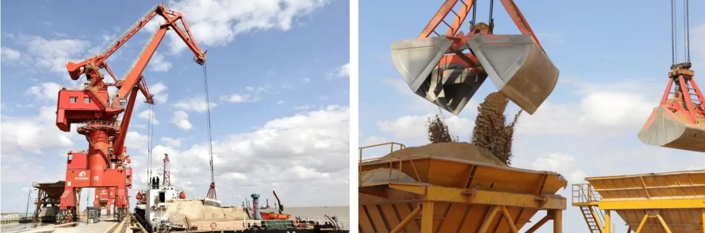 紅色的門機(jī)下行駛著來(lái)來(lái)往往的貨車,紅色的漏斗等著他一次次的閉合