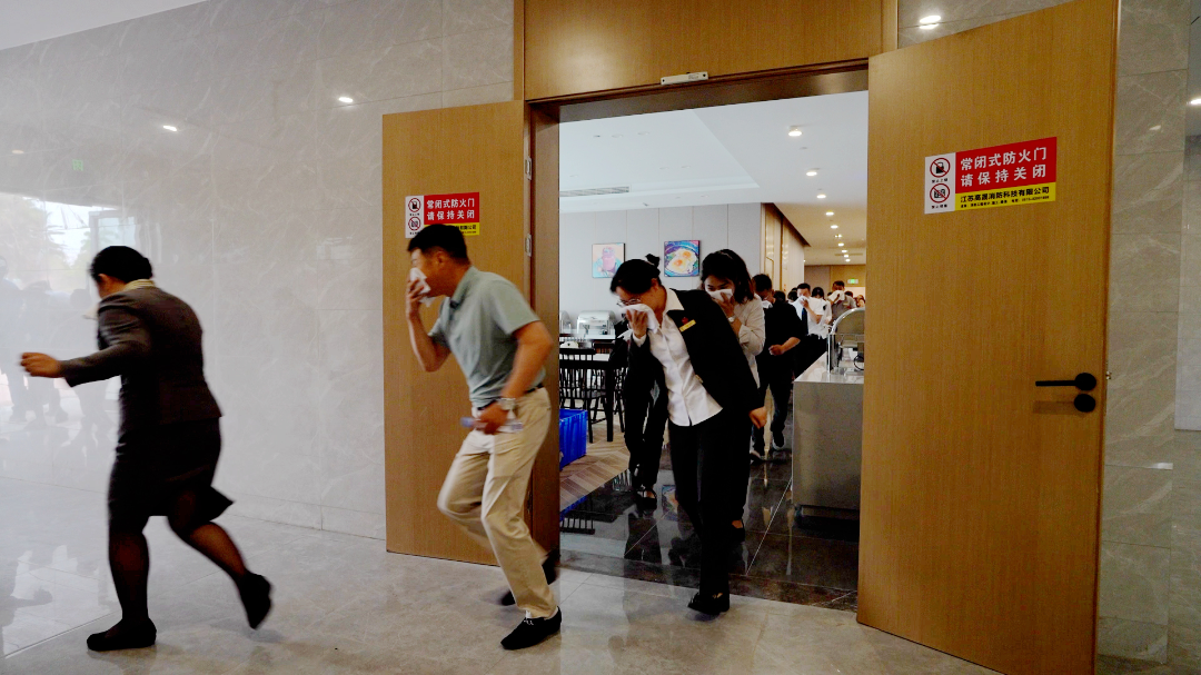 只見滾滾濃煙迅速彌漫開來,消防監控中心發現“火情”后,立即按照應急預案行動起來。安保組迅速至火情點,進行初起火災撲救;酒店值班組則通過廣播等方式通知各樓層人員進行疏散;疏散組引導著人們用濕毛巾捂住口鼻,彎腰低姿有序地撤離現場。在疏散過程中,有人因緊張摔倒,疏散組人員趕緊上前攙扶幫助其安全撤離。整個演練過程緊張有序,各個環節緊密銜接。