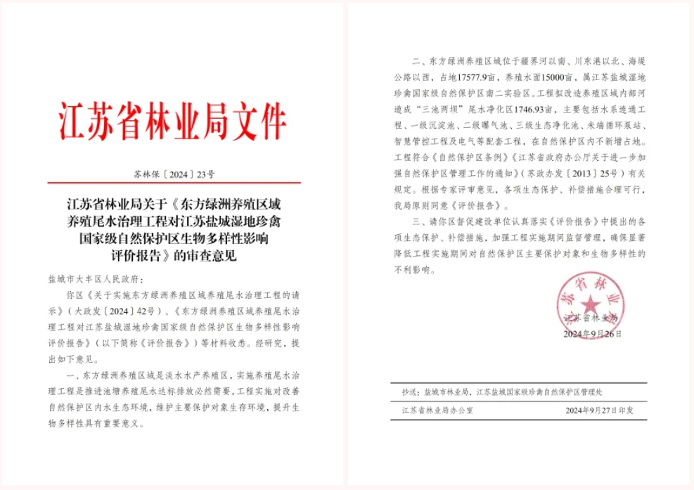 近日,江蘇省林業(yè)局發(fā)布關(guān)于《東方綠洲養(yǎng)殖區(qū)域養(yǎng)殖尾水治理工程對江蘇鹽城濕地珍禽國家級自然保護(hù)區(qū)生物多樣性影響評價報告》的審查意見,充分肯定了農(nóng)業(yè)科技集團(tuán)養(yǎng)殖尾水治理項目在改善自然保護(hù)區(qū)內(nèi)水生態(tài)環(huán)境、維護(hù)主要保護(hù)對象生存環(huán)境以及提升生物多樣性的重要意義,并同意項目實施。