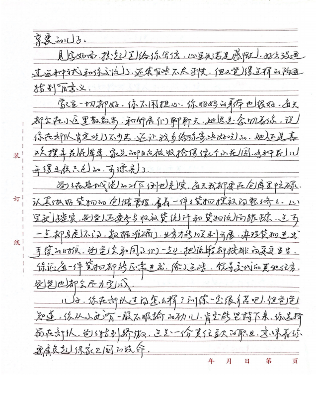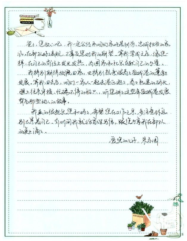 字里行間流露出對(duì)雙親的敬仰之情,細(xì)數(shù)在軍旅或職場(chǎng)中的成長點(diǎn)滴,并鄭重承諾將“忠誠、奮進(jìn)”的家風(fēng)薪火相傳,以實(shí)際行動(dòng)回饋家庭與社會(huì),同時(shí)深切期盼家庭團(tuán)聚的美好時(shí)光。