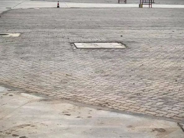 堆場區(qū)域,1處方形電力井蓋因施工疏忽未恢復(fù)井蓋,且未設(shè)置警示反光標(biāo)識,存在人員墜落風(fēng)險(xiǎn)。