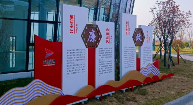 通過召開黨風廉政專題會、班子交心會、重大節日思廉會、法務知識宣講等,傳達學習集團關于《廉潔風險防控管理工作制度》等要求,推動黨風廉政建設落細落實;利用辦公樓內環形走廊的空白墻面,樓宇四周的閑置空地因地制宜、系統規劃,將廉潔文化與港口企業文化深度融合,精心打造“廉政文化走廊”與“廉潔文化墻”,把清風傳承潤“海港”的思想理念融入港區生產經營、黨建管理、項目建設、安全生產等工作全過程,根植“港口有魂、心中有責、眼中有光”的擔當底色。