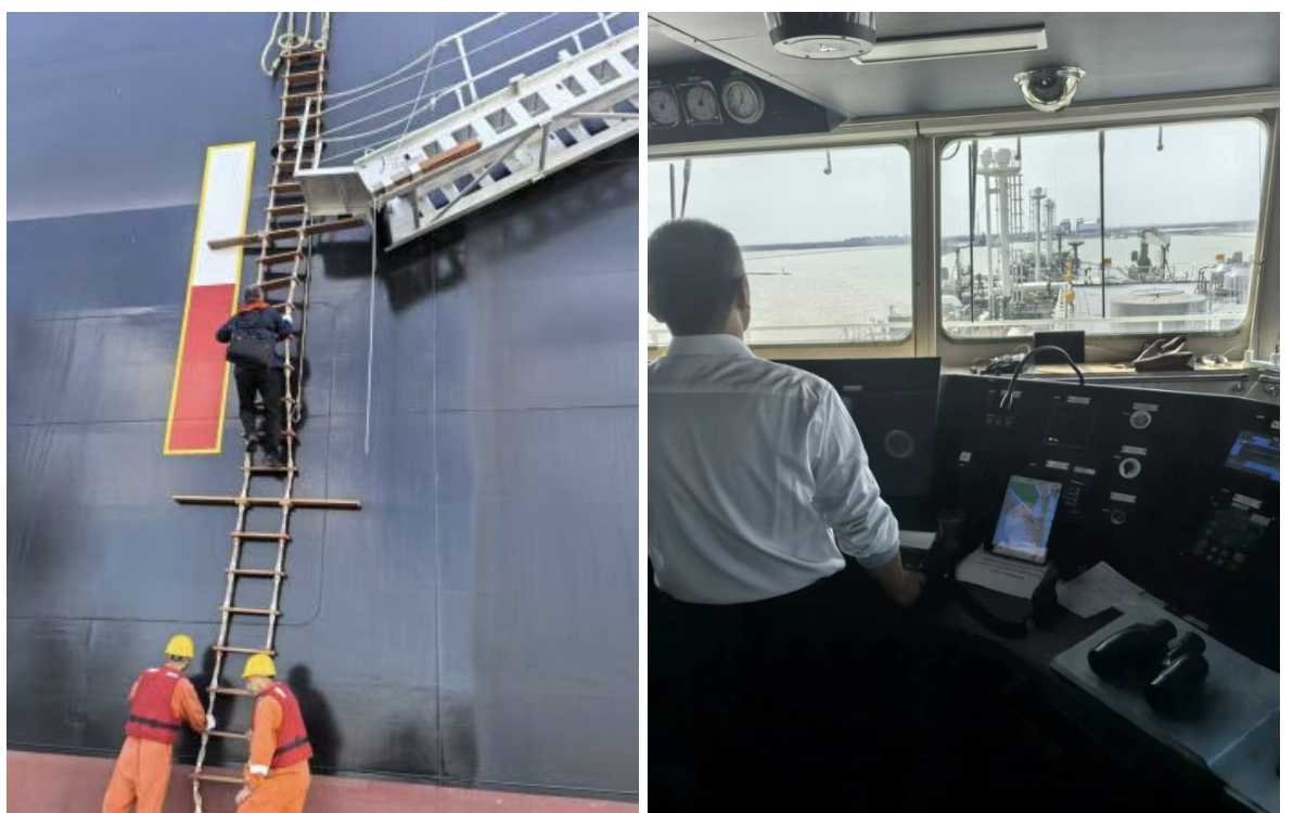 為確保此次高危試航萬(wàn)無(wú)一失,鹽城港引航站提前72小時(shí)啟動(dòng)應(yīng)急機(jī)制,通過(guò)三維模擬推演,最終確定以“雙拖輪前置頂推+三拖輪尾舵輔助”的五拖輪陣型護(hù)航,將船舶漂移控制在米級(jí)。靠泊前,引航員登輪完成全船安全掃描,并與海事部門(mén)建立秒級(jí)通訊鏈路以共享實(shí)時(shí)動(dòng)態(tài)。作業(yè)中,引航員在100號(hào)浮彎道精準(zhǔn)利用水流變化,安全完成55度轉(zhuǎn)向;靠泊時(shí)更通過(guò)視覺(jué)與激光雙重校驗(yàn),將觸碰速度控制在0.05節(jié)(相當(dāng)于人步行的1/20),完美避免低溫船體因沖擊受損。