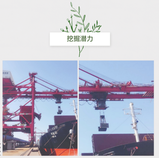深入挖掘設備潛能,實施了一系列“賦能升級”計劃。改進卸船機水渣抓斗工藝,從原有的14m3、21T的水渣抓斗采購16.9m3、25T的抓斗,使其在滿足額定起重量要求的同時,具備煤炭備用抓斗的功能;對堆料機進行流量升級,通過改造漏斗、支架等細節,平均流量從1800T/H提升至2200T/H,在提高堆料機的穩定性和效率的同時,也降低了新設備采購的成本。