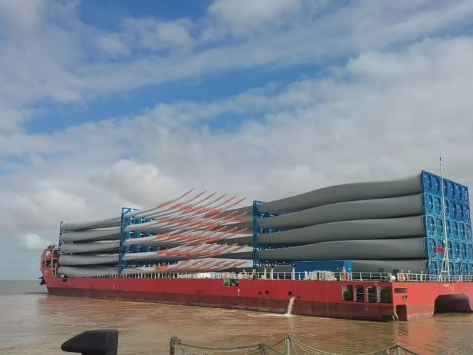 在新時代“鹽城港鐵軍淮海戰役”市場開拓大會戰期間,忽聞“遠景能源印度項目”有成套葉片出口計劃,鹽城港射陽港區風電公司攬貨組在得知此消息后,立即奔赴遠景能源物流部、船代、船東、貨代等單位,登門宣傳射陽港口岸開放情況,最終達成合作。港區也在突破“外貿風電”新貨種的同時,實現了“單船作業風電葉片數量最多”“作業效率時間最短”兩項之最。截至當前,實現外貿風電吞吐量12.15萬噸。