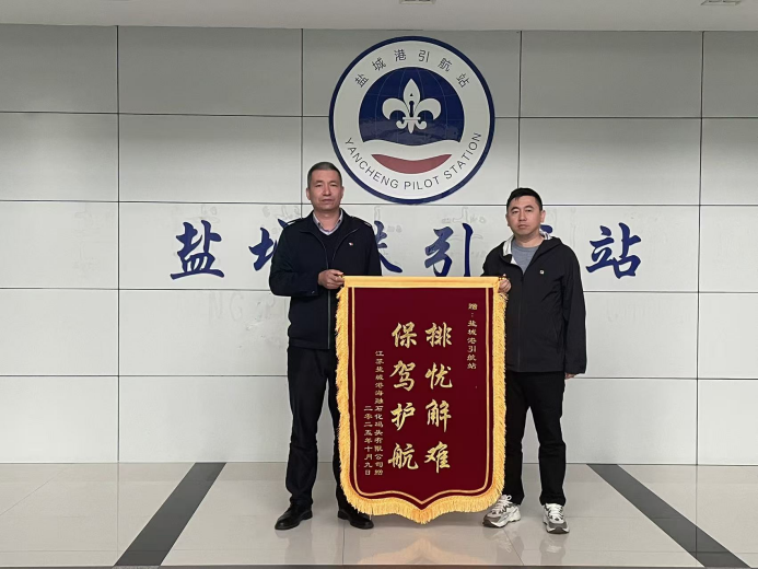 接到求助后,引航站迅速組織專業團隊趕赴現場。在登輪勘察后,團隊成員綜合研判氣象條件與作業進度,決定待貨物卸載完畢后再擇機出港。當晚22:00,引航員登輪,在拖輪配合下頂風浪開始引航。面對復雜海況,引航員依托豐富經驗謹慎操縱船舶,通過實時監測風浪、科學規劃航線,確保船舶以安全航速穩步離港。船舶航行途中遭遇突發陣風,引航員迅速采取應急措施,及時修正航向,歷經數小時緊張作業,最終成功將“探界者”輪安全引領至外海避風錨地。事后,江蘇鹽城港海融石化碼頭有限公司專程向鹽城港引航站贈送錦旗,書以“排憂解難 保駕護航”表達謝意。
