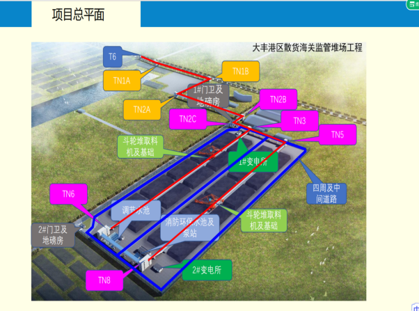 該項(xiàng)目陸域用地面積25.03萬(wàn)㎡,其南北向縱深約736.83米,東西向?qū)挾葎t約為318.97米。作為大豐港區(qū)重點(diǎn)工程的一部分,該項(xiàng)目從二期散貨堆場(chǎng)已建的T6轉(zhuǎn)運(yùn)站預(yù)留的2路皮帶機(jī)接口延伸而來(lái),旨在通過(guò)T6轉(zhuǎn)運(yùn)站皮帶機(jī)的延伸及大豐港現(xiàn)有臨時(shí)堆場(chǎng)用地范圍內(nèi)相應(yīng)配套設(shè)施的建設(shè),進(jìn)一步提升港口的功能性和效率。