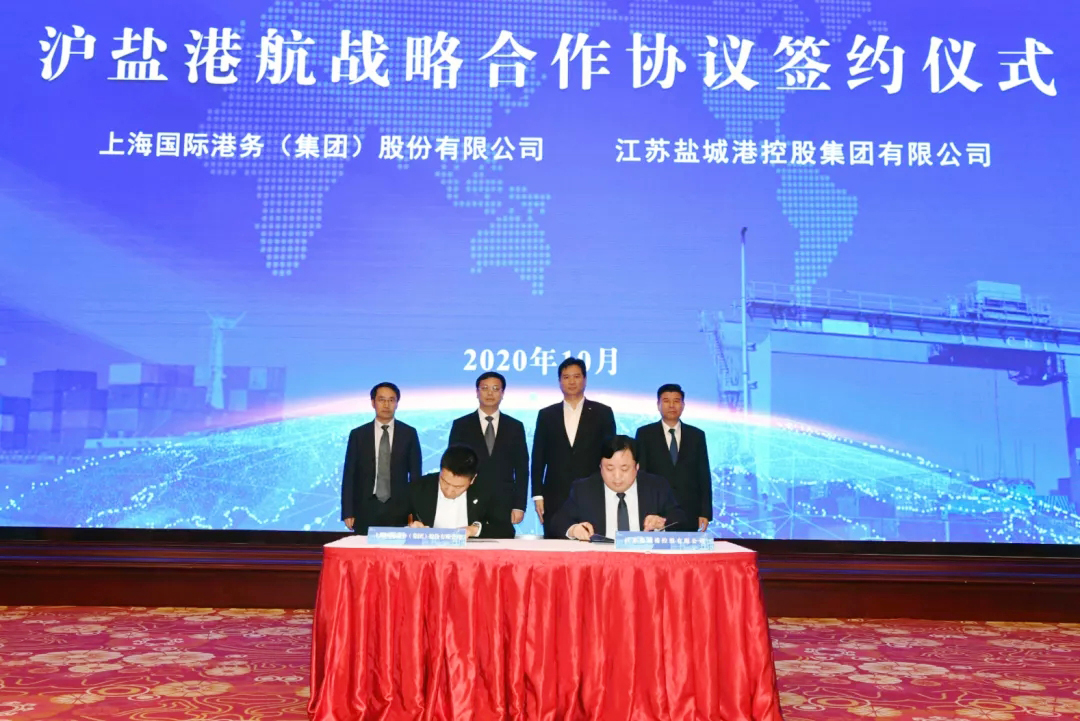 10月30日下午,滬鹽港航合作活動暨鹽城港集裝箱海河聯運航線推介會在鹽城舉行,江蘇鹽城港控股集團和上海國際港務集團簽訂戰略合作協議。鹽城市市長曹路寶、上海國際港務集團總裁嚴俊出席,共同為合資成立的江蘇鹽城港上港國際港務有限公司揭牌。