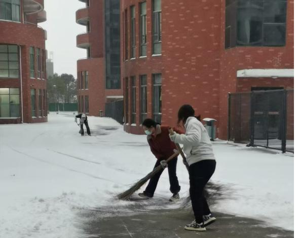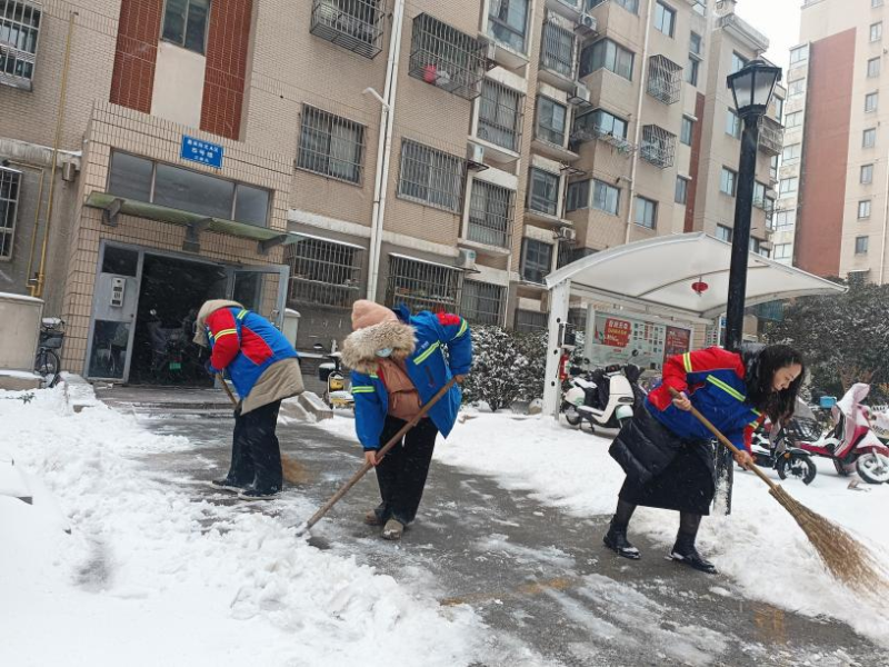 在鹽城幼兒高等師范學校南校區,鹽城港物業團隊連夜啟動應急預案,天亮前便投入掃雪除冰戰斗。大家分組協作揮鍬破冰、清掃積雪,在教學樓、宿舍樓出入口細心鋪設防滑草墊,經過兩小時持續作業,為師生開辟出條條暢通無阻的“平安路”“暖心道”。風雪中,物業人員俯身清掃的身影,成為校園里最安穩的風景。